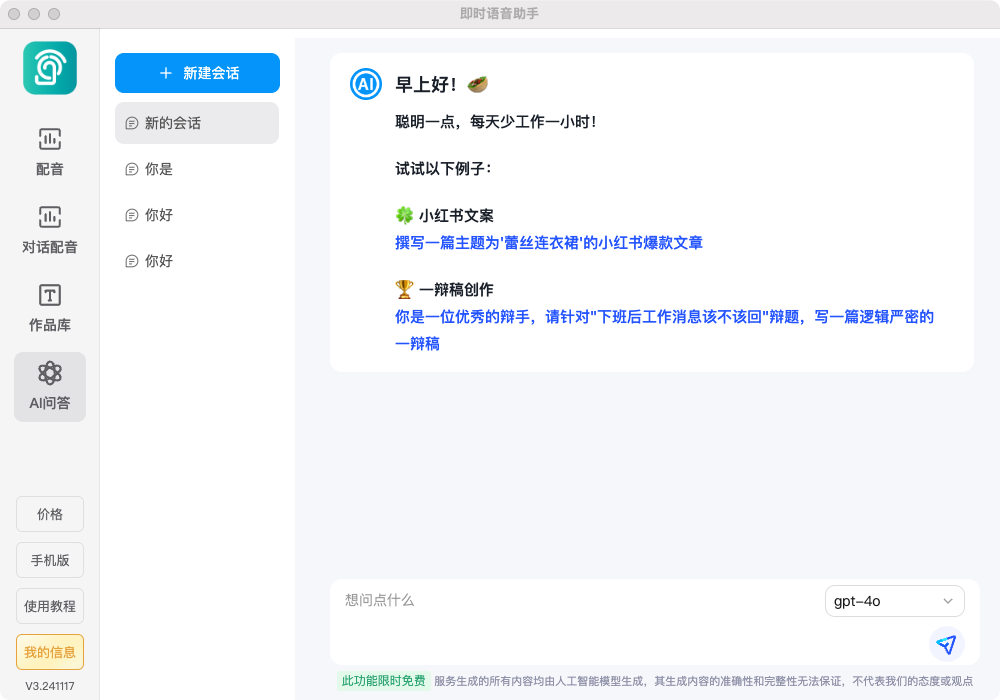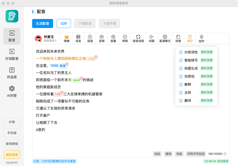 即时语音助手是一款速度快、价格低、功能强大的语音合成工具